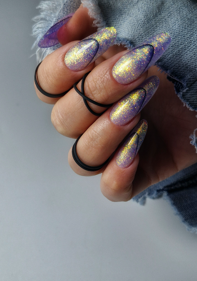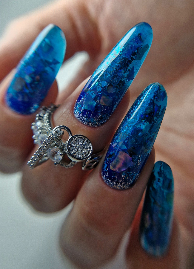 9.Всевозможные дизайны с использованием блёсток, ракушек, цветных гелей, полигелей, гелей-желе и т.п