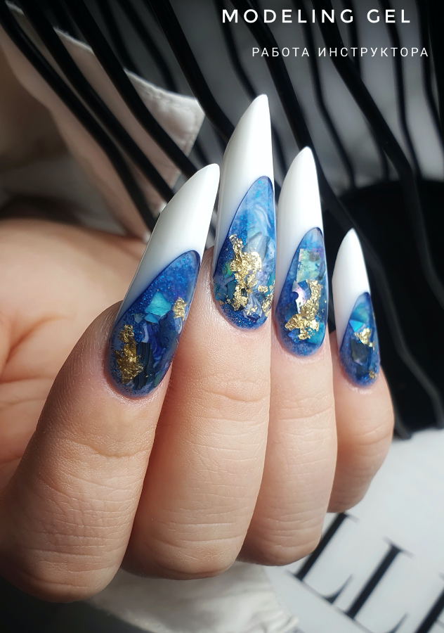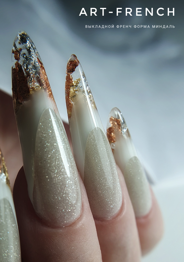 Второй день миндаль - выкладной френч, рисованный френч, аквариумный дизайн , витражные гели, текстуры на выбор.